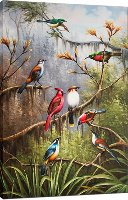 Canvas print of an oil painting featuring colourful birds in the forest. The canvas is wrapped around a 100% certified FSC wooden pine stretcher bar frame.