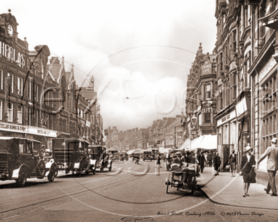 Broad Street with what appears to be a Taxi rank in the middle of the road, Reading in Berkshire c1920s