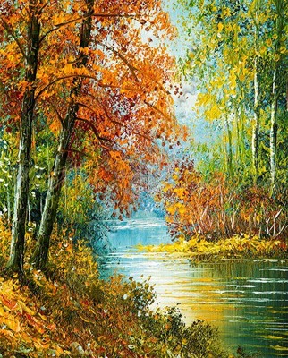 Canvas print of an oil painting featuring a colourful river scene through the forest. The canvas is wrapped around a 100% certified FSC wooden pine stretcher bar frame.