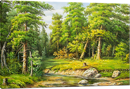 Canvas print of an oil painting containing a Summer Forest and River scene wrapped around a 100% certified FSC wooden pine stretcher bar frame.