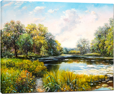 Canvas print of an oil painting containing an Summer river scene wrapped around a 100% certified FSC wooden pine stretcher bar frame.