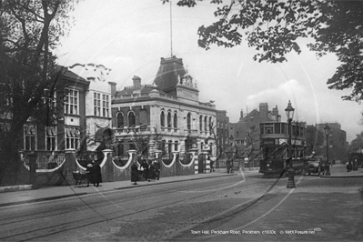 LCC Tram Class E 1 Route 54 to Victoria No 1395, passing Town Hall, Peckham Road in South East London c1936