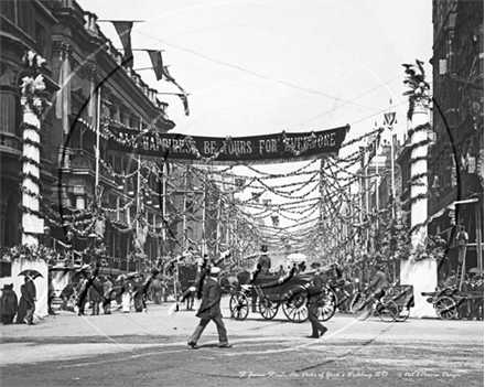 St James Street, London, bedecked with bunting in celebration of the Duke of York's wedding to Mary of Tech (future King George V and Princess Mary) c1893