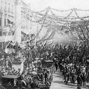 St James Street bedecked with bunting celebrating Queen Victoria's Diamond Jubilee c1897