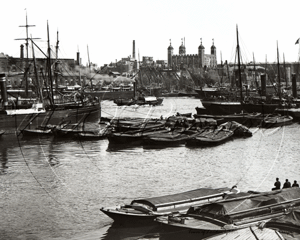 The Tower of London together with a rank of "Growler" cabs in London c1880s
